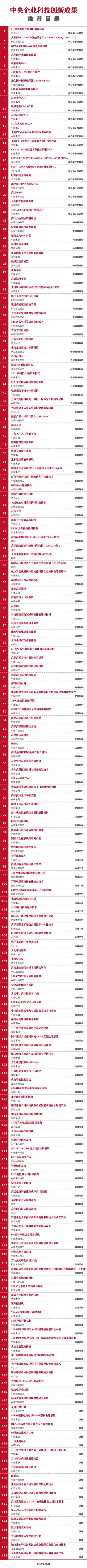 去年以来,为促进中央企业科技成果向现实生产力转化,加快成果应用推广,国资委组织开展中央企业科技创新成果征集工作,通过征集遴选、专家评估、专利审核等环节形成《目录》,包括核心电子元器件、关键零部件、分析测试仪器、基础软件、关键材料、先进工艺、高端装备以及其他等8个领域共178项技术产品。其中,在核心电子元器件领域有魂芯系列DSP、高速安全芯片、高速高精度ADC、高压IGBT等,在基础软件领域有“九天”人工智能平台、麒麟操作系统、BIMBase建模软件等,在关键零部件领域有特高压直流换流变压器、核级温度传感器、重载车轮、轨道交通驱动齿轮装置等,在关键材料领域有纳米气凝胶复合材料、对位芳纶、超细高纯锗粉、钽靶材、T800级高性能碳纤维等,在先进工艺领域有芳烃成套技术、集成电路制造BCD工艺、飞机内饰件3D打印技术、电子束处理工业废水技术等,在高端装备领域有高动态宽频带五轴飞行仿真转台、重型H型钢精轧机组、氢燃料电池发动机、特种型钢万能轧机等。
